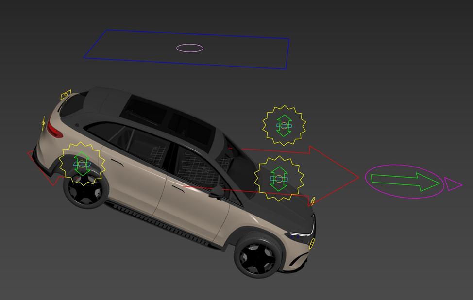 Главный контрольный объект. Трансформирует весь риг. Имеет все степени свободы. При перемещении по локальной оси Y происходит автоматическое вращение колес при любом повороте Главного контрола в плоскости XY при перемещении в режиме Speed Algorithm (см. вкладку “Wheels Rotation”), и абсолютно любом повороте в любом направлении при перемещении в режиме Quality Algorithm. Для анимации перемещения авто, необходимо анимировать именно этот контрол. Также можно масштабировать риг с его помощью, колеса продолжат корректно вращаться в соответствии с новым диаметром. Имеет кастомные атрибуты в стеке модификаторов с дополнительными функциями, описанными далее.